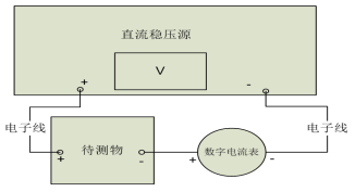 工作电流测试:待测物串联接入数字电流表,通过稳压源让待测物正常工作,即可通过数字电流表读取工作电流。如图1: