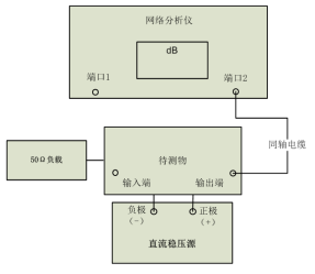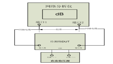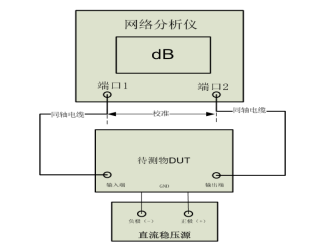 LNA增益测试,网络分析仪双端口校准后,待测物的输入输出端分别接入网络分析仪端口1和端口2进行增益测试。如图2:
